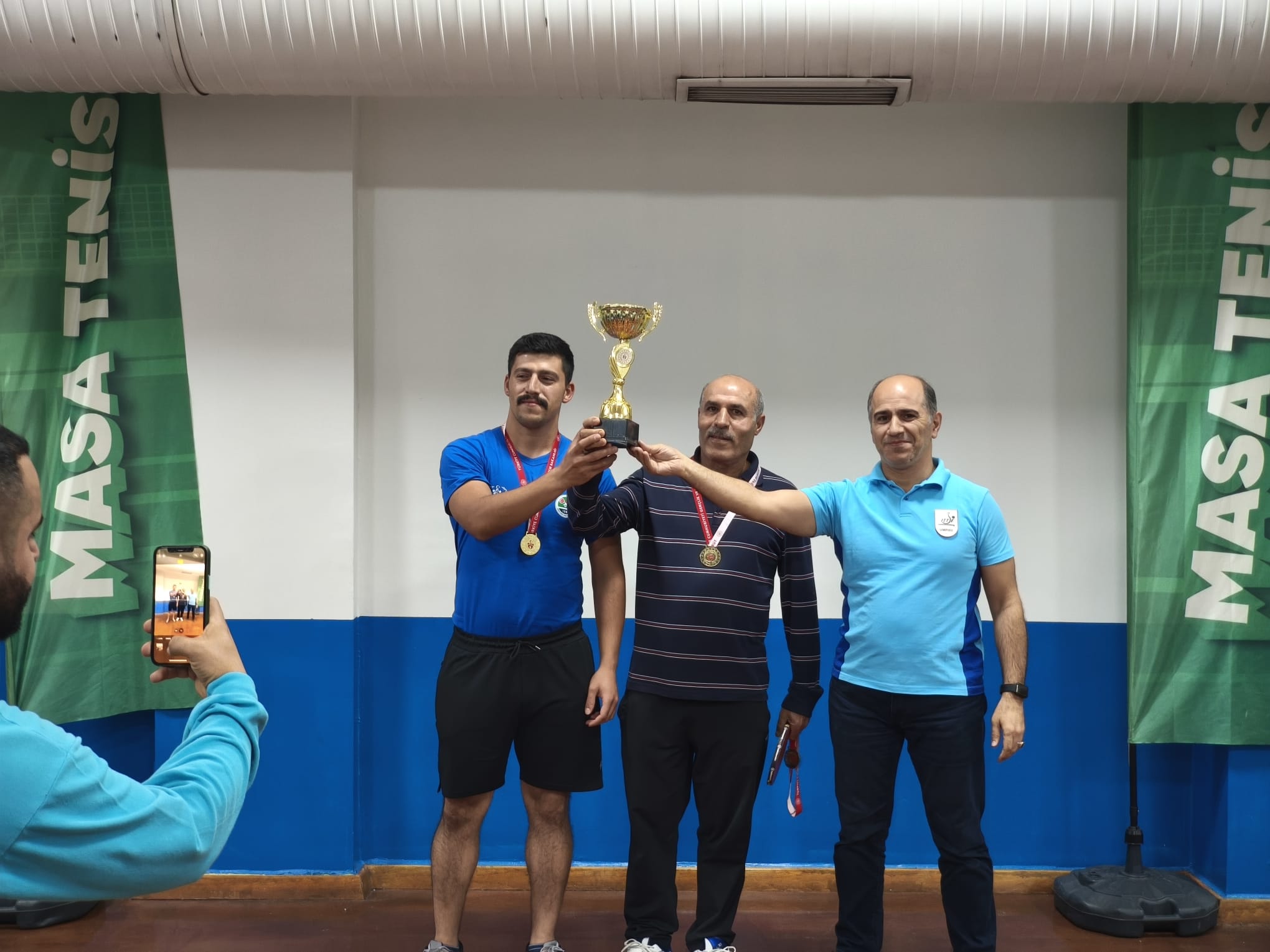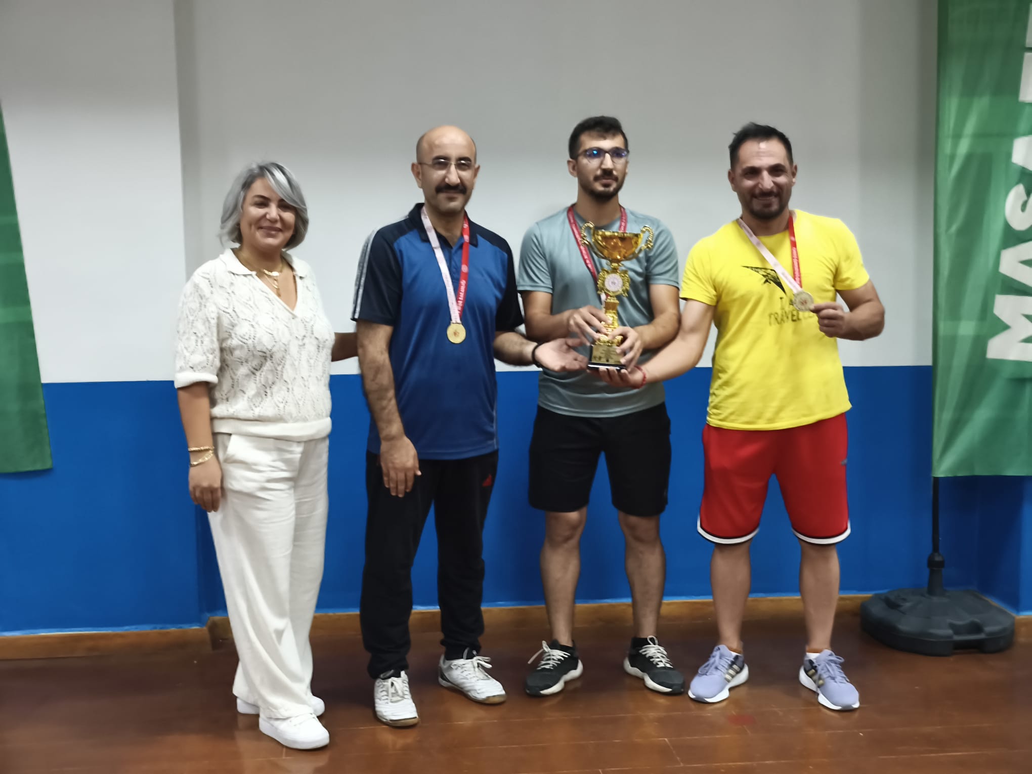 BATMAN MASA TENİSİ İL TEMSİLCİSİ M .ORHAN EDİS ,ULUSLARARASI BAŞ HAKEM M.HAMDİN GÜVEN VE SALON AMİRİ EBEDİYE HANIM TARAFINDANTARAFINFAN KUPALARI VERİLDİ